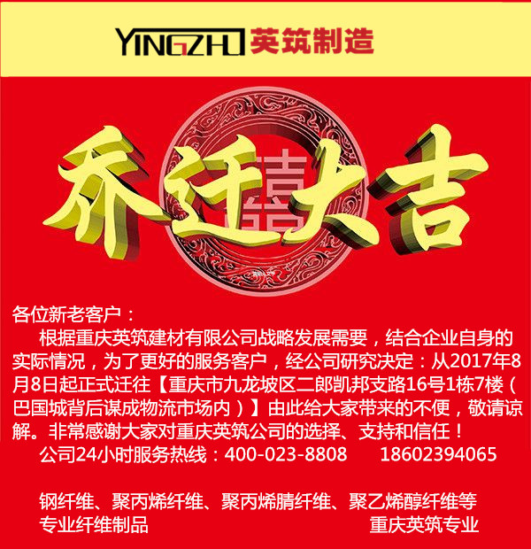 根据重庆英筑建材有限公司2017年战略发展需要,结合企业自身的实际情况,为了更好、更优、更快捷的服务各位客户。经公司研究决定:从2017年8月8日起正式迁往【重庆市九龙坡区二郎凯邦支路16号1栋7楼(巴国城背后谋成物流市场内)】。由此给大家带来的不便敬请谅解,非常感谢大家一直以来对重庆英筑公司的选择、支持和信任!